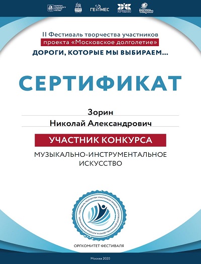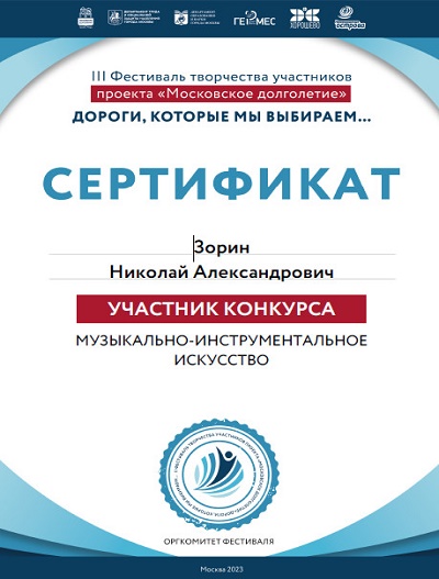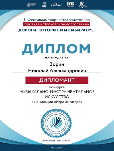 в номинации "Музыкально - инструментальное искусство" в составе группы гитаристов "Долголетие",